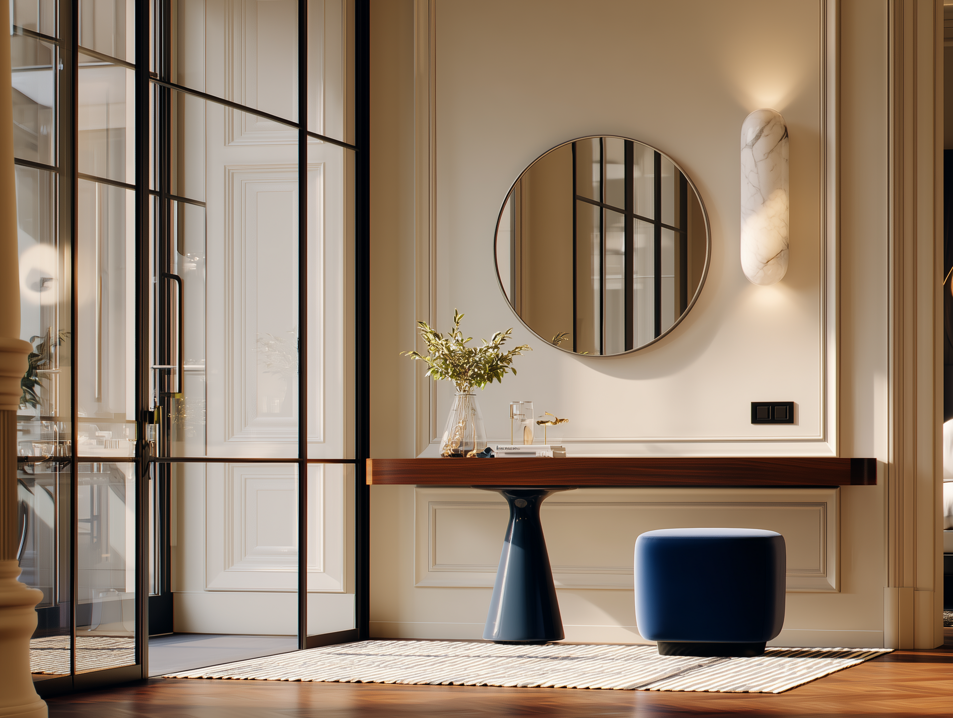 Ons belangrijkste concept was om alle muren te bedekken met "geheime Victoriaanse lambrisering", ontworpen door onze studio. Wat is het geheim? Achter de panelen verbergen we functionele op maat gemaakte meubels zoals kasten, deuren, parapluopslag, radiatoren en andere.